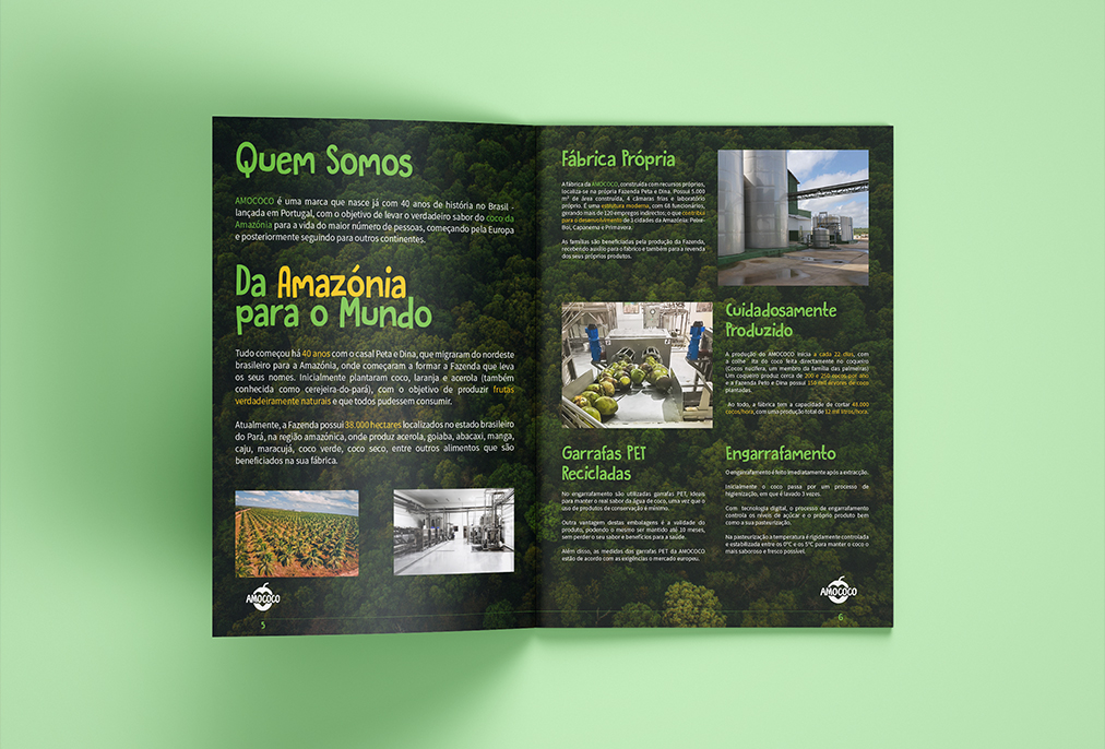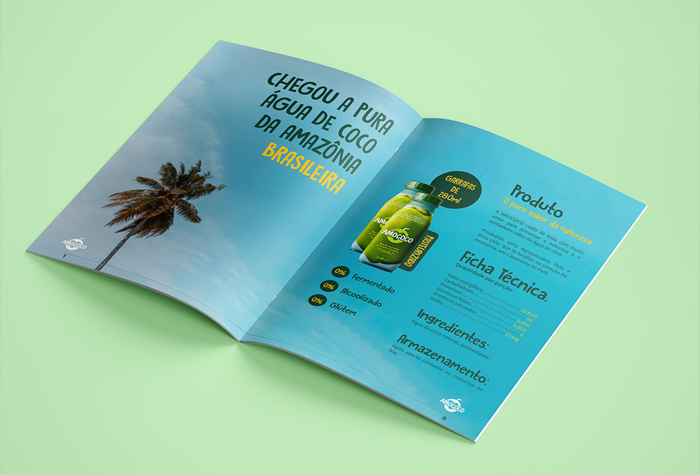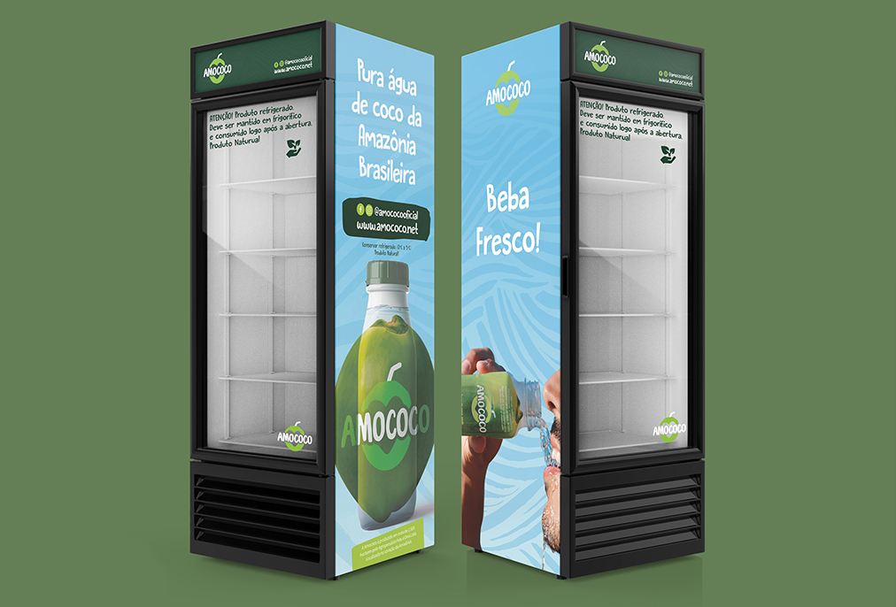 For the portfolio, we decided to give Amococo a look that would convey the brand’s purpose of bringing the flavor of the coconut from the Amazon to Portugal. So we are concerned with bringing all the visual awesomeness of the Brazilian Amazon Forest, through tropical colors and elements with a lot of life. So that the company could promote the brand with its partners, we also developed the art for a stylized refrigerator of the brand.