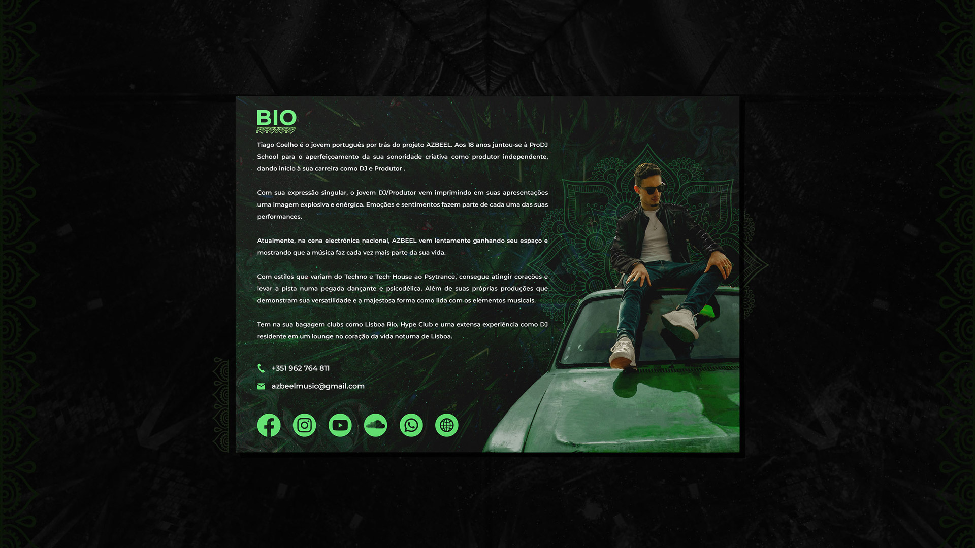Introducing a sleek, 2-page Press Kit for the emerging Portuguese DJ and producer Tiago Coelho, the creative mind behind AZBEEL. This Press Kit is designed to accentuate his dynamic performances and passion for a wide range of styles, including Techno, Tech House, and Psytrance.