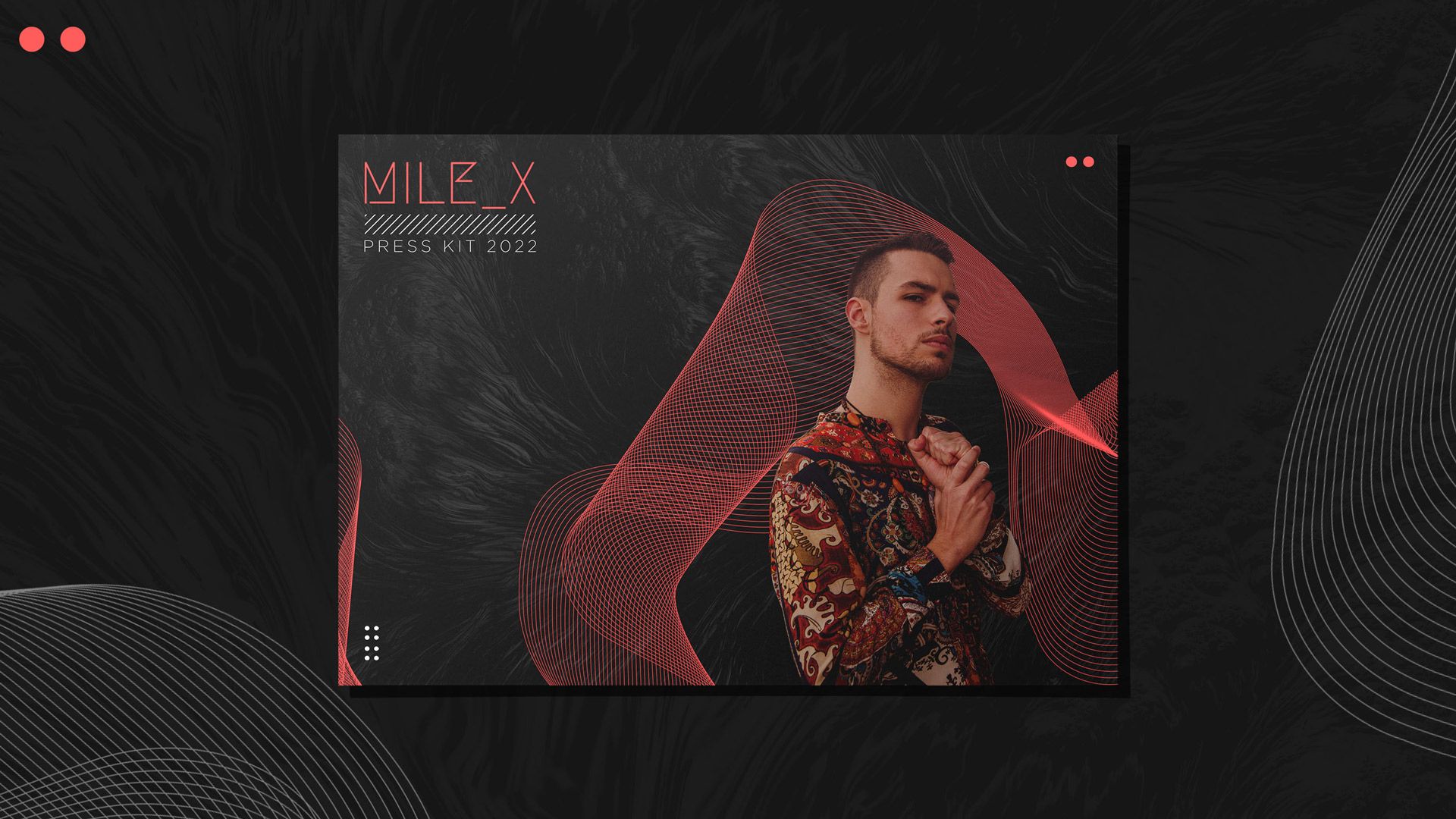 The Press Kit is designed to highlight MILE_X’s vibrant personality and unique musical style, while presenting key information about his career and accomplishments in a visually engaging way. The layout is sleek and modern, using bold typography, striking images, and a dynamic color palette that represents the electrifying nature of his performances.